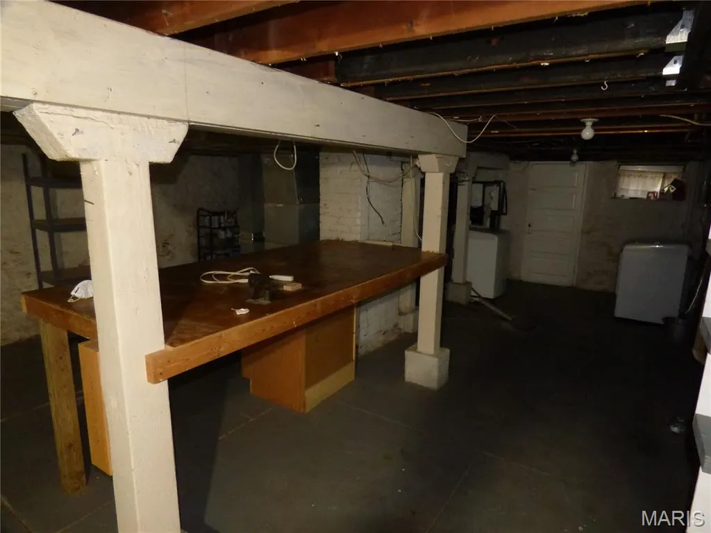Large workbench in basement with clean HVAC and newer water heater.