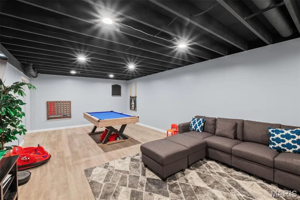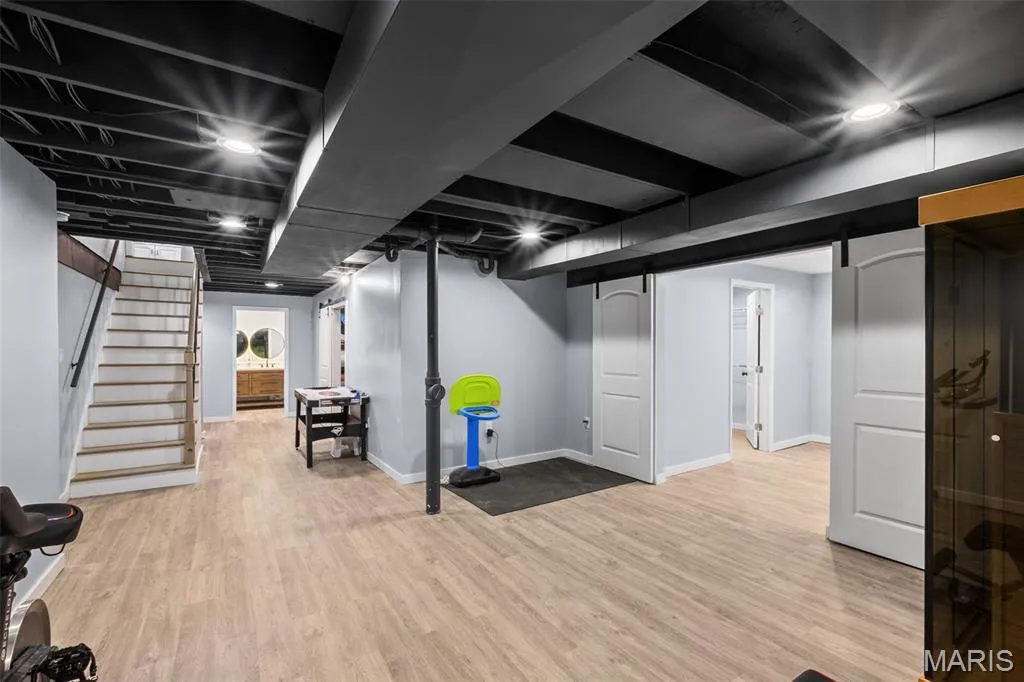 Basement : Sleeping Area, Concrete, Storage Space, Finished, Other, 8 ft + Pour, Bathroom