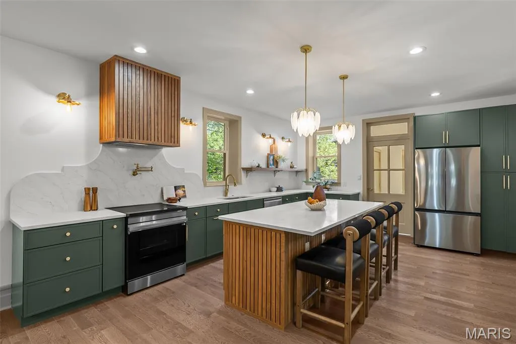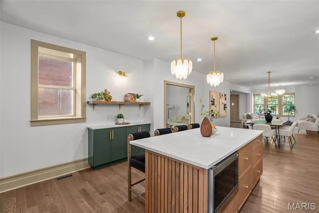 The main level features a thoughtfully designed floor plan with generous living and dining spaces, highlighted by the gorgeous custom kitchen with quartz countertops, a striking wood-paneled island and unique backsplash making it the heart of the home. A bonus family room enhances space and privacy for everyday living.