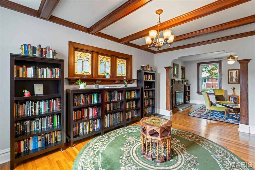 Interior Features : Coffered Ceiling(s), Walk-In Closet(s), Custom Cabinetry, Eat-in Kitchen, Dining/Living Room Combo, Historic Millwork, Kitchen Island, Natural Woodwork, Other, See Remarks