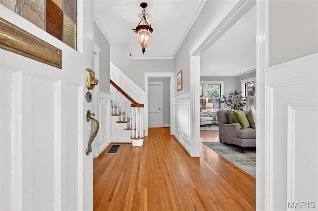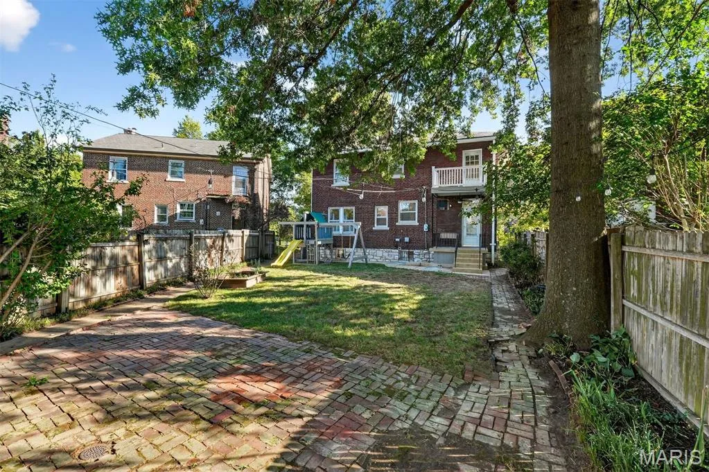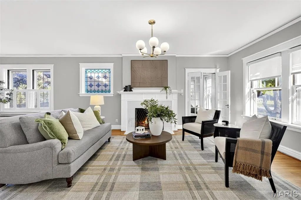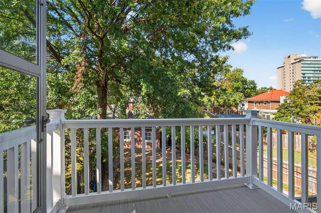 Perfectly positioned at the edge of Clayton, this beautifully maintained 4-bedroom home blends timeless architecture with thoughtful updates—all in one of the city’s most sought-after locations. A spacious center hall floor plan welcomes you with light-filled rooms and an easy, open flow. The generous living room with fireplace opens to a charming three-season cocktail porch—ideal for relaxing or entertaining. The elegant dining room connects seamlessly to the original butler’s pantry and a bright, updated kitchen featuring custom cabinets, stone countertops, and newer appliances. Upstairs, four cheerful bedrooms offer ample closet space, while the stylishly updated full bath boasts classic subway tile and fresh finishes. The newly finished lower level adds flexible living space for a family room, media lounge, or private retreat. Outdoors, enjoy a beautifully landscaped yard with a two-tier deck, classic brick patio, and direct views of a landscaped community green space. An oversized 2-car garage with private alley access adds everyday convenience. With easy access to top schools, Forest Park, DeMun Village, shopping, transit, and major highways, this home offers exceptional charm and unbeatable location.