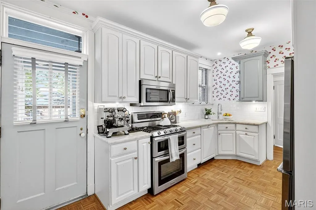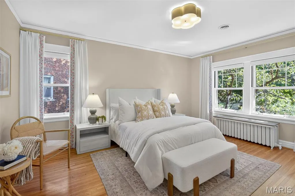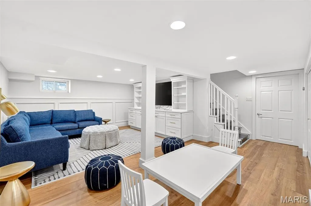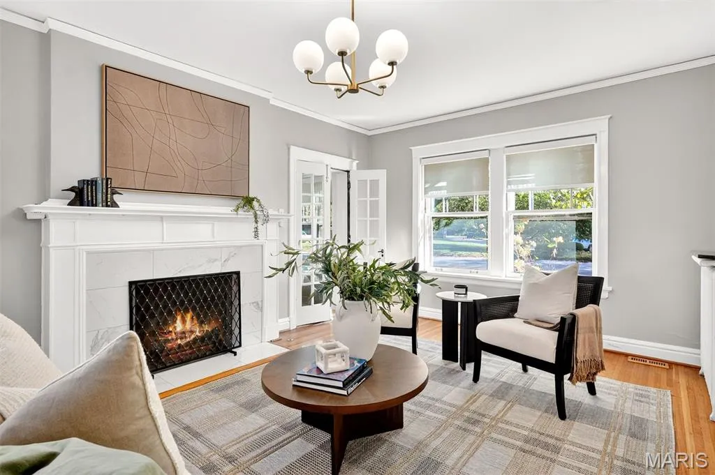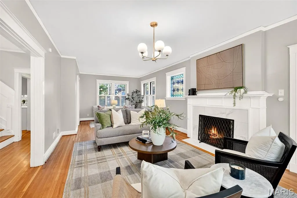 Perfectly positioned at the edge of Clayton, this beautifully maintained 4-bedroom home blends timeless architecture with thoughtful updates—all in one of the city’s most sought-after locations. A spacious center hall floor plan welcomes you with light-filled rooms and an easy, open flow. The generous living room with fireplace opens to a charming three-season cocktail porch—ideal for relaxing or entertaining. The elegant dining room connects seamlessly to the original butler’s pantry and a bright, updated kitchen featuring custom cabinets, stone countertops, and newer appliances. Upstairs, four cheerful bedrooms offer ample closet space, while the stylishly updated full bath boasts classic subway tile and fresh finishes. The newly finished lower level adds flexible living space for a family room, media lounge, or private retreat. Outdoors, enjoy a beautifully landscaped yard with a two-tier deck, classic brick patio, and direct views of a landscaped community green space. An oversized 2-car garage with private alley access adds everyday convenience. With easy access to top schools, Forest Park, DeMun Village, shopping, transit, and major highways, this home offers exceptional charm and unbeatable location.