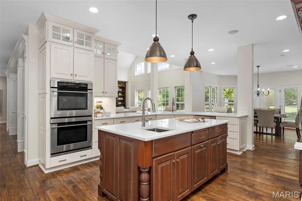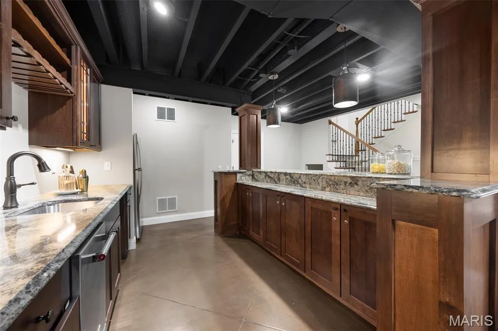 Interior Features : Open Floorplan, Bookcases, High Ceilings, Separate Dining, Vaulted Ceiling(s), Walk-In Closet(s), Custom Cabinetry, Eat-in Kitchen, Granite Counters, Shower, Two Story Entrance Foyer, Butler Pantry, Solid Surface Countertop(s), Breakfast Bar, Breakfast Room, Kitchen Island, Double Vanity, Lever Faucets, Central Vacuum, Walk-In Pantry, Bar